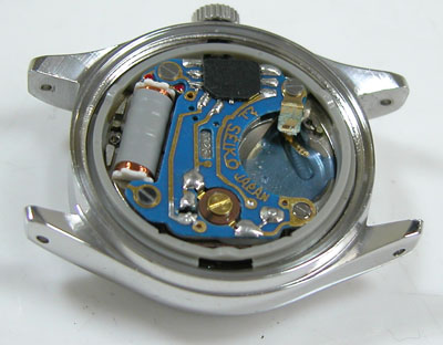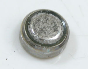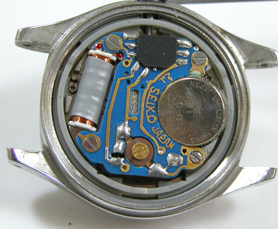 入っていた電池をチェックしますが電池も液漏れ。純正SEIKO電池といえども長期間放置すれば液漏れするようです。結果、電池交換のみでは不動でした。クォーツの発信パルスが出ておりませんから「回路不良」を起こしております。ただもう交換パーツはありません。