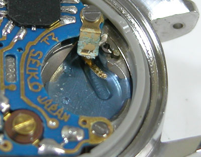 綺麗になったケースにムーブメントを戻して電池格納部をチェックしますが・・。