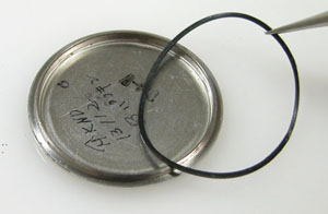 パッキンにシリコン塗布をして裏蓋に戻し。このパッキンは平パッキンなので交換パーツがありません。
