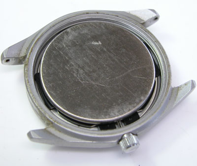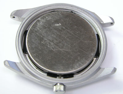 裏蓋を開けると耐磁プレートがムーブメントを覆っています。