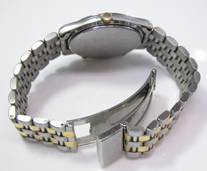 カーブガラスに金色ベゼル。ステンレス半無垢バンドに三つ折れバックル。