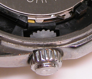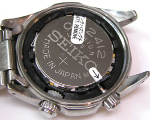 裏蓋を開けると電池が見えます。インナーベゼルを回す歯車も見えますね。