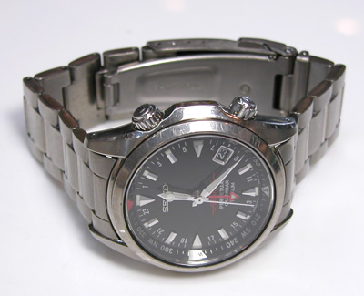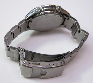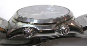 竜頭が2つ見えますが一つはインナーベゼルを回す竜頭が見えます。チタン無垢バンドに三つ折れプッシュバックル。