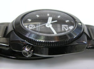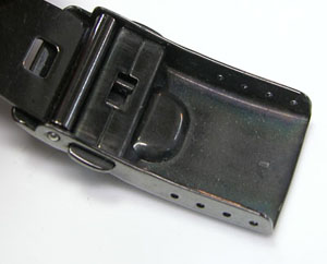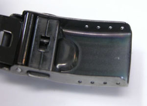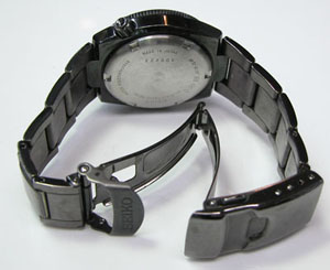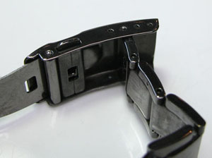 ステンレス無垢バンドに三つ折れプッシュバックル&ダブルロック。