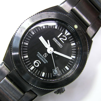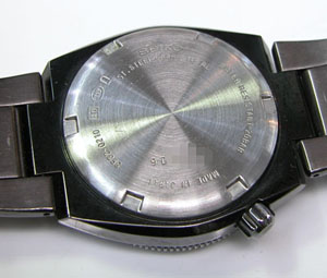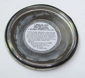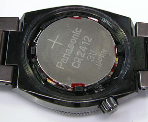 裏蓋の裏側もチェックしますが湿気た跡がありますね・・。裏蓋を開けると電池がムーブメントを覆っています。
