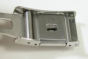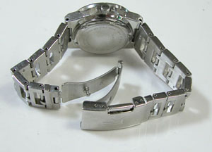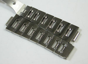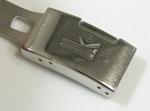 ステンレス無垢バンドに三つ折れプッシュバックル。