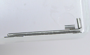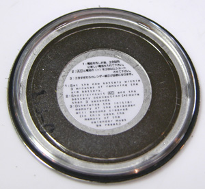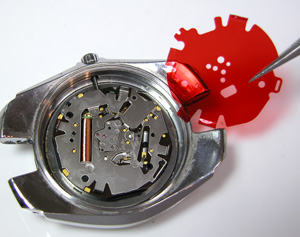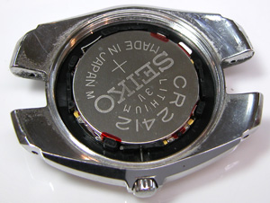 裏蓋を開けると電池が見えます。次に電池を外すと赤い絶縁フィルムが。