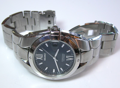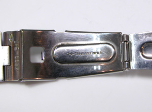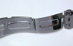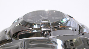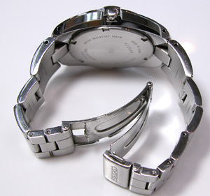 ベルトはステンレス無垢バンドに三つ折れプッシュバックル。裏蓋スクリューバック。