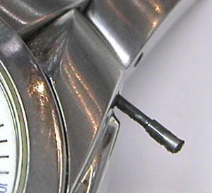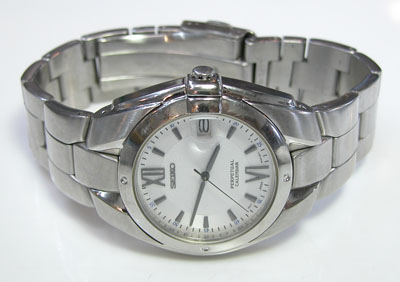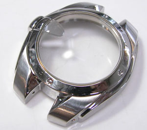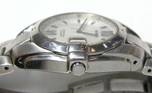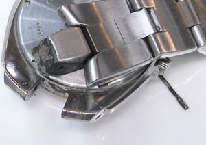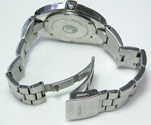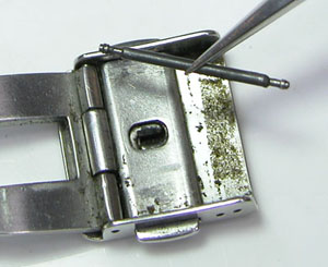 ステンレス無垢バンドに三つ折れプッシュバックル。