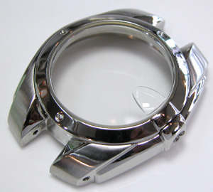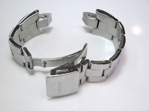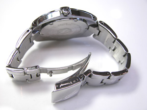 ステンレス無垢バンドに三つ折れプッシュバックル。裏蓋はスクリューバックで。