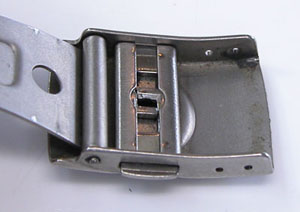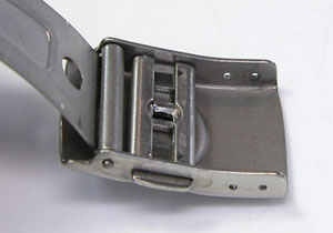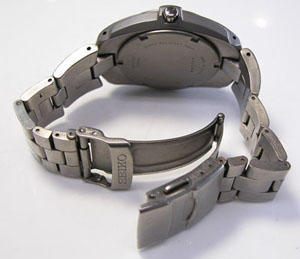 チタン無垢バンドに三つ折れプッシュバックルはダブルロック。
