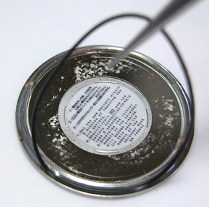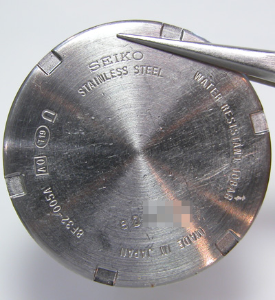 裏蓋のパッキンを外して掃除します。このタイプの腕時計は”10年電池”です。10年開けることが無い前提の割にはパッキンが細い気がしますね・・。セイコーさんの事ですからキッチリ計算とテストもしているでしょうが。 赤い絶縁フィルムは外します。