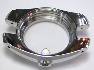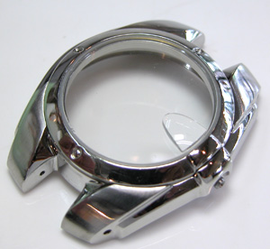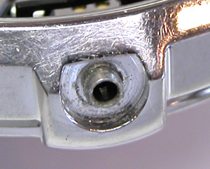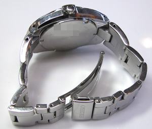 ステンレス無垢バンドに三つ折れプッシュバックル。裏蓋はスクリューバック。
