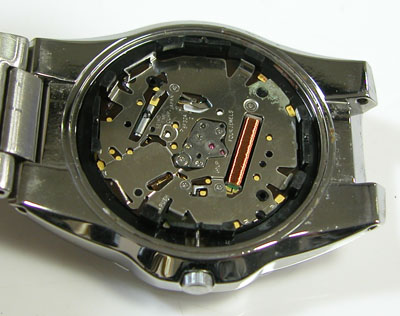 裏蓋を開けると電池がムーブメントを覆っています。