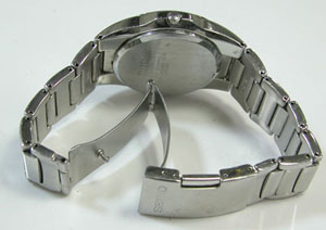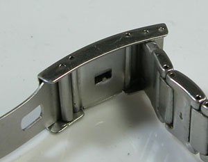 ステンレス無垢バンドに三つ折れプッシュバックル。