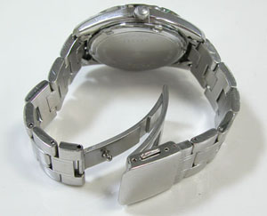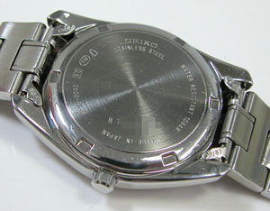 裏蓋を開けると電池がムーブメントを覆っています。この電池は交換されておりますので交換の必用は無いでしょうから「電池交換無しのケース・バンドの洗浄のみ2500円」コースに変更ですね。