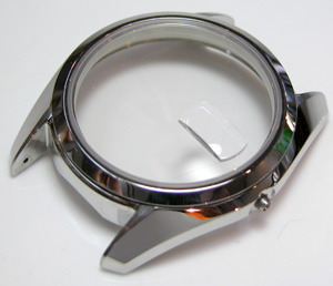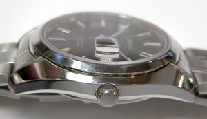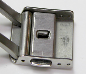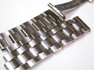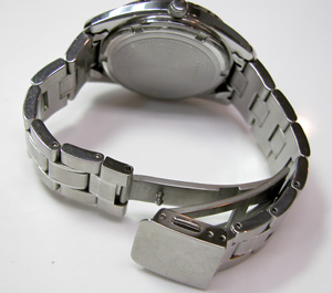 サイクロップレンズが印象的。ステンレス無垢バンドに三つ折れプッシュバックルも無垢仕様。