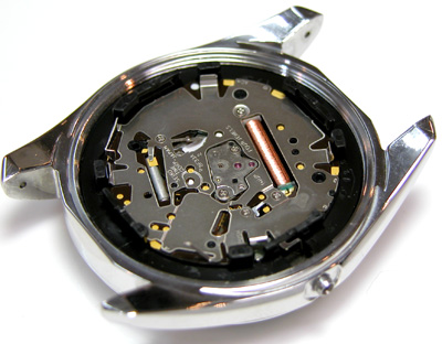 これが裏蓋を開けたところですが電池で覆われてムーブメントは見えません。