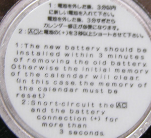 裏蓋の裏側記載で右が内容ですが「電池を外したら、3分以内に新しい電池を」と書いてありますが、絶対無理です。わたしはムーブメントを取り出してしまうもので(;^_^A