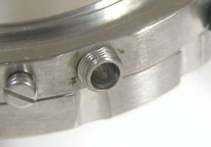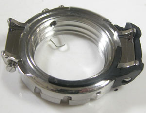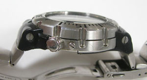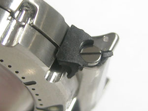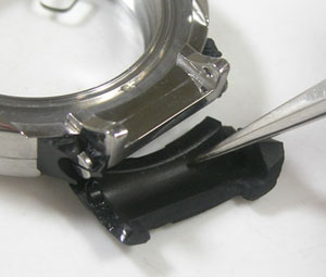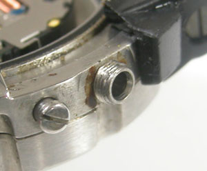 裏蓋はスクリューバックで右が裏蓋記載。黒いウレタン部分が竜頭、辺りで欠損。「これは承知のうえです」という記載もありましたが。もう加水分解が始まっている証拠。