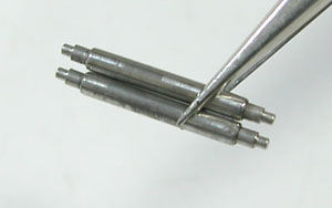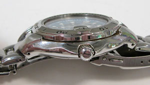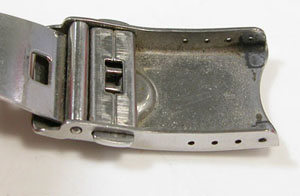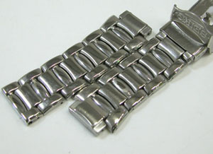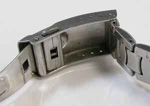 ステンレス無垢バンドに三つ折れプッシュバックルはダブルロック。