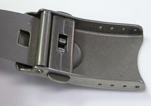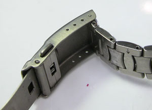 チタン無垢バンドに三つ折れプッシュバックルはダブルロック。