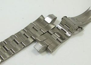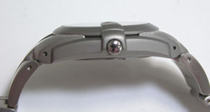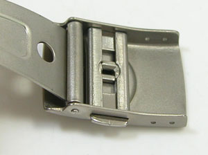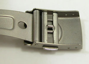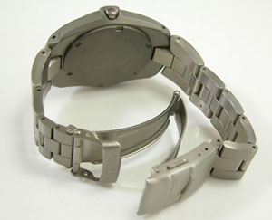 チタン無垢バンドに三つ折れプッシュバックルはダブルロック。