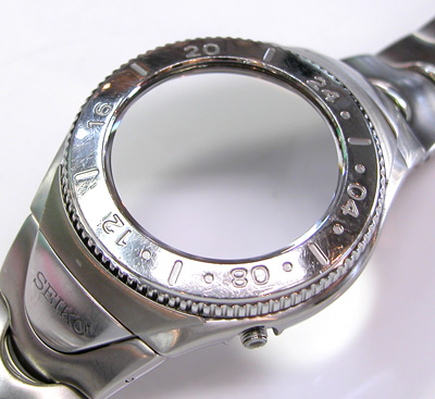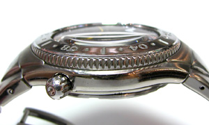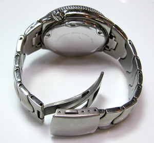 回転ベゼルに、ねじ込み竜頭はダイバー仕様。チタン無垢バンドに三つ折れ無垢プッシュバックル。
