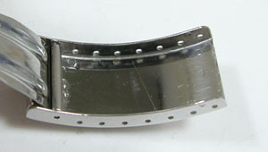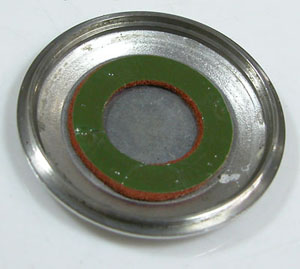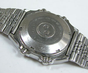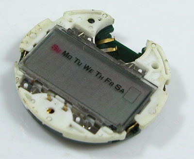裏蓋の裏側もチェックします。はて?この緑のテープは何か?電池が動かないように工夫された跡ですね・・。