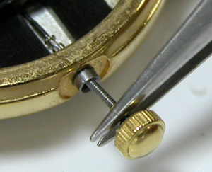 これがムーブメントです。お馴染みエプソンですね。先ずは、竜頭を抜いて。