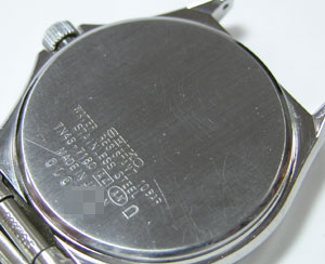 これが裏蓋記載。ベルトの片方が錆び付いて外れませんでした。