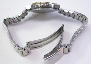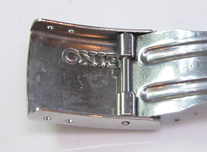 ステンレス板巻きバンドに三つ折れバックル。