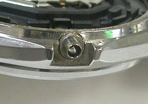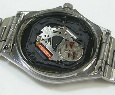 綺麗になったケースにムーブメントを戻して電池格納部をチェックします。パッキンは交換してシリコン塗布をして裏蓋に戻します。