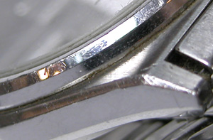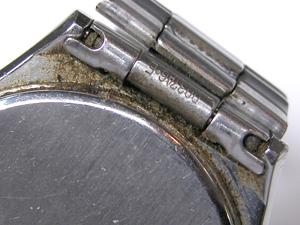 ベゼルとケース接点も凄い。軽くケースとベルトごと洗浄。バネ棒が見えましたし錆びも落ちています。