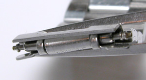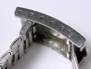 バックルのバネ棒微調整部の位置チェック。裏蓋は”はめ込みタイプ”でも10気圧防水時計です。