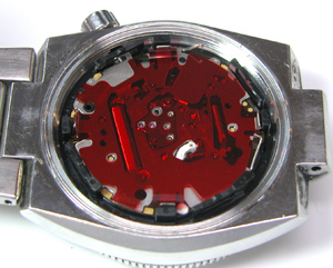 これが取り出した文字盤&ムーブメント。電池を外すと赤い絶縁フィルムが見えます。