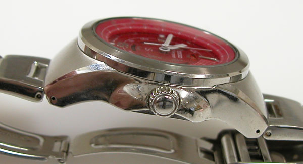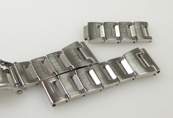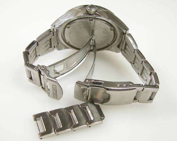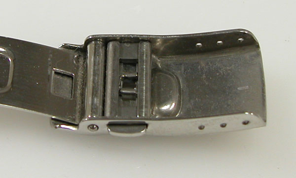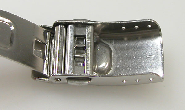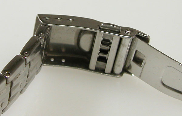 ステンレス無垢バンドに三つ折れプッシュバックルはダブルロック。