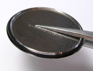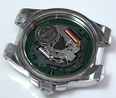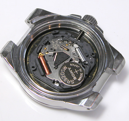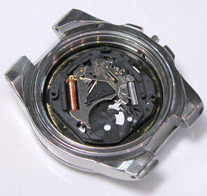 ムーブメントをケースに収めて電池格納部をチェックします。