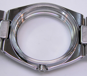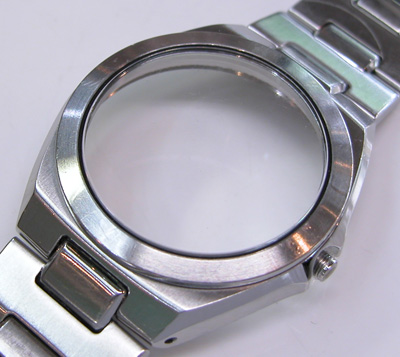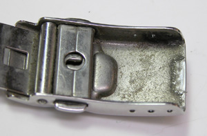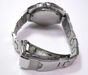 ステンレス無垢バンドに三つ折れプッシュバックル。