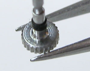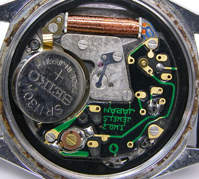 綺麗になったケースにムーブメントを戻して電池格納部をチェックですが、その前に湿気た跡がクッキリ。電池交換では動かずに注油調整で動きましたが本来はOHが必用。