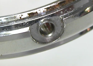 これがムーブメントですがケースの縁にもサビが。サイトで写真で眺めている場合、こういうパターンは珍しいですが実店舗ではこういう状態の腕時計は7割くらいなるでしょうか?それだけ腕時計内部にまで注意を払う人は居ないと言うことなんですね・・。