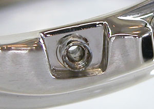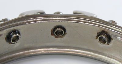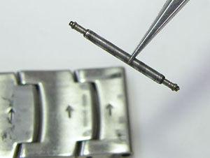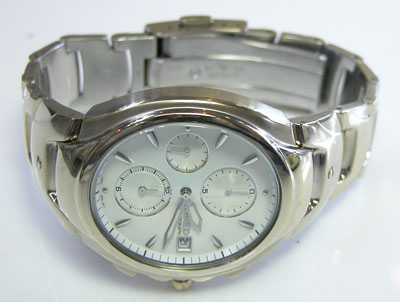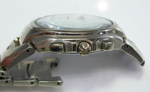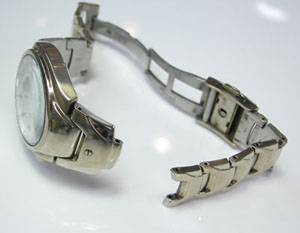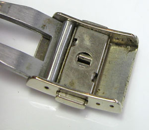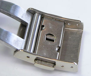 ステンレス無垢バンドに三つ折れプッシュバックルですがベルトは外れている。