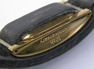 本体を革の輪にくぐらせてバネ棒で留めてあります。