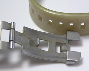 腕時計本体のみになりました。裏蓋の汚れが目立ちますが、パッキンが効いているのが良く分かります。