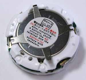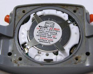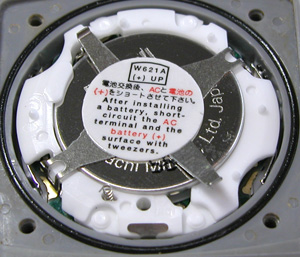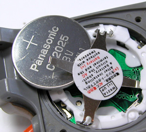 ムーブメントを戻して電池交換。これが電池、リチュウム”CR2025"ですね。電池格納部をチェック。