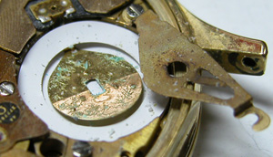 竜頭パイプもチェックします。これが取り出した文字盤&ムーブメント。