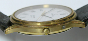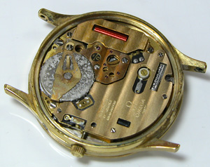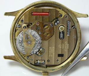 OMEGA De ville 1332分解掃除です。竜頭の横にプッシュボタンがありますが、これを押さえて分針を早送りします。