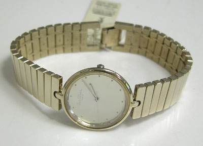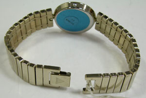 カーブガラスはサファイアガラスでブレスバックルの腕時計。このベルトステンレス無垢でこの厚みですから薄型ながら重厚感もあります。スーツにピッタシきそうな雰囲気ですがデザインから女性がつけても違和感は無いでしょう。