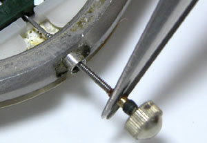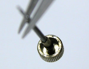 竜頭抜をきます。引き出せない状況でしたから、これを抜くのには苦労しました。ピンセットで摘んでいる所が錆びていますが、この程度なら交換しなくて大丈夫。勿論、後で竜頭パッキンにもグリースを注します。